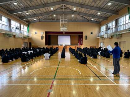 月曜日に放送で全校集会を行いました。1年生は体育館で放送を聞きました。
