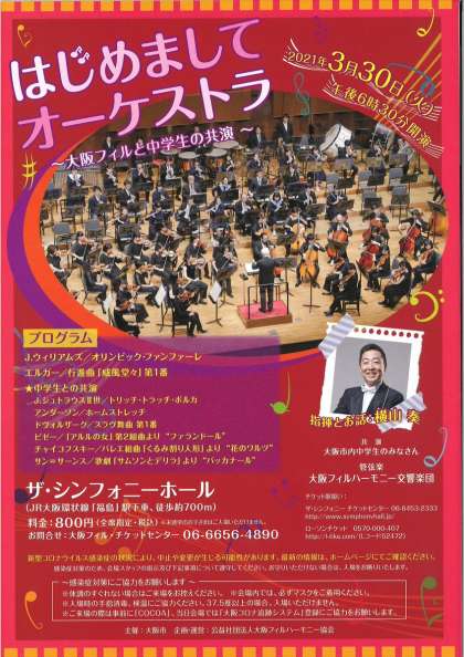 「大阪市では、青少年の皆さんがクラシック音楽に触れ、親しんでいただけるよう、『はじめましてオーケストラを開催いたします。大阪市立中学校吹奏楽部の生徒の皆さんと、プロのオーケストラが共演いたします。チケットは以下のところで販売しております。是非ご鑑賞ください。