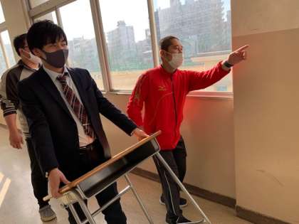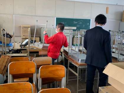 明日が始業式ということもあり、先生方は教室準備に取り組んでいます。机を交換したり、名列シールを張ったりと、準備しています。