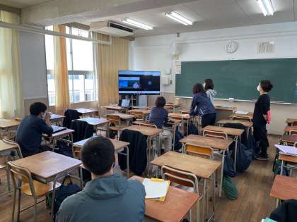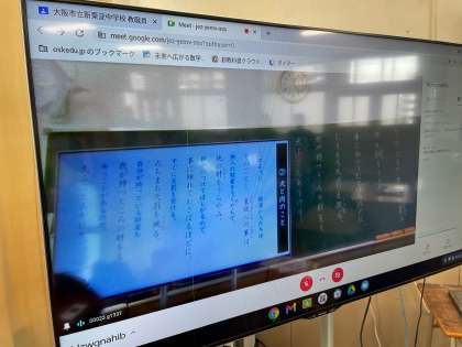 教室の授業の様子を、他の教室で、生徒目線の画面で見ました。画像の映り具合や、黒板の文字の大きさなど、試してみないと気付かないことも多くあったので、良い時間となりました。このような研修を繰り返し行いながら、教員のICTスキルの向上に努めたいと思います。