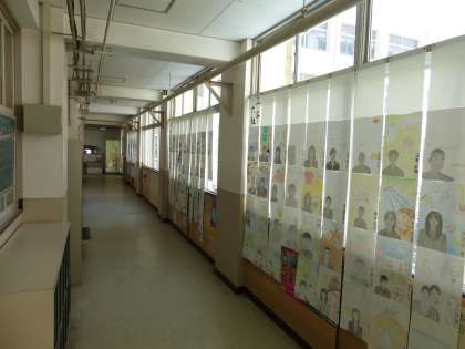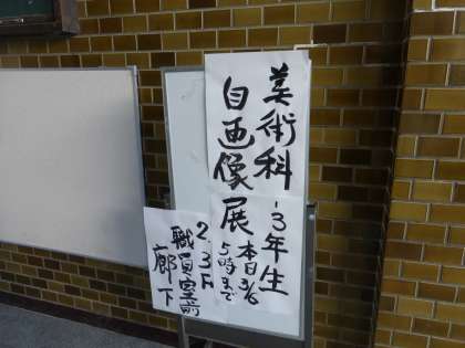 3年生の生徒たちが美術の時間に作成した自画像を、2階及び3階職員室前に展示されています。さすが3年生と思わせる力作揃いです。 この自画像は卒業文集に掲載されています。