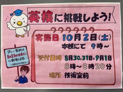 英語検定の申込みを8月30日(月)〜 9月1日(水)に格技室前で行います。時間は午前8時〜8時20分までです。申込用紙に検定料を添えて申し込んでください。