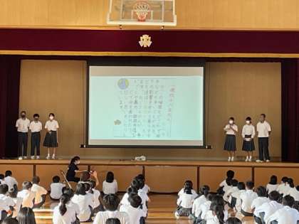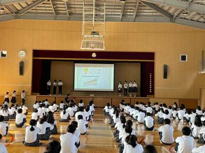 1年生はSDGs調べ学習の学年発表会を行いました。3週間に渡り、調べてきたことを新聞にまとめ、各クラスの代表班が体育館で発表しました。審査の結果、最優秀班が5組3班、優秀班が6組5班に決まり、この2班は15日の文化発表会で発表します。