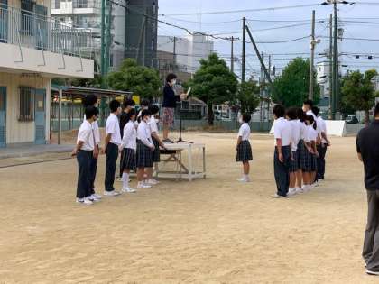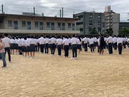 本日、久しぶりに、グランドで全校集会を行いました。緊急事態宣言が続いていたので、リモートや放送での集会が続いていました。しかし、ようやく通常通りの集会を行うことが出来ました。