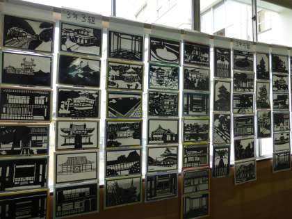 土曜公開授業に来校された保護者のみなさまにみていただこうと、3年生が「京都」をテーマに、美術の授業で製作した切り絵を2階職員室前に展示しました。