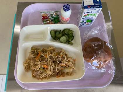 本日の給食は焼きそばです。パンがあるので、パンに挟んで焼きそばパンにしてもおいしそうですね。