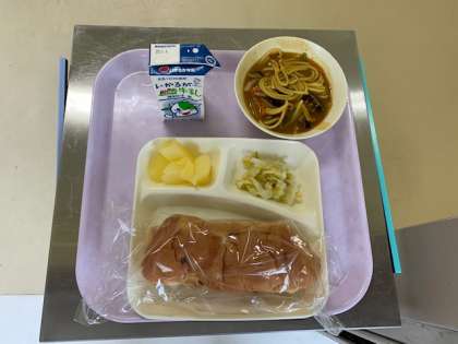 今日の給食は「カレースープスパゲッティ」です。カレーと麺が一つになったお得感のあるメニューです。今日はパン給食の日だったので、生徒からは「ご飯がよかった」などという声もあがっていましたが・・・