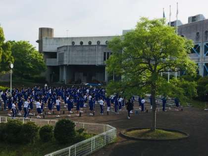 おはようございます。晴天のもと、集いの広場でラジオ体操を行いました。