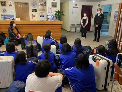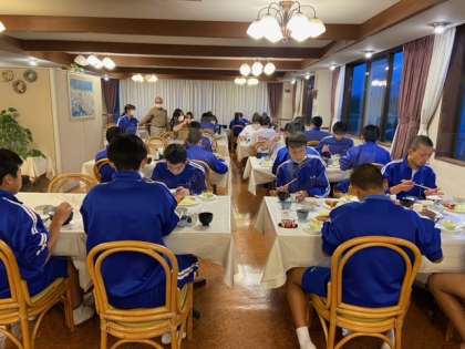 今夜はクラスごとにペンションに分宿します。入館式を行い、美味しい夕食をお腹いっぱいいただきました。