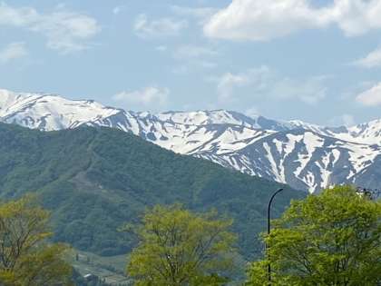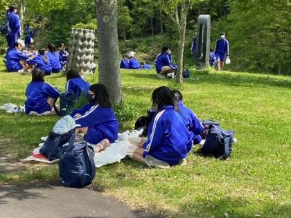 午後の体験活動にむけて、ラフティングを楽しんだ犀川を後にしました。途中、公園で、北アルプスを眺めながら昼食をとりました。