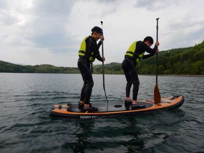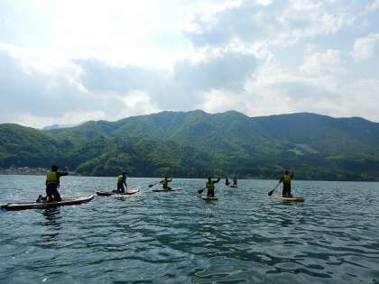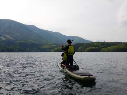 1つめはSUP、スタンドアップパドルボードです。文字通りボードの上に立ち、パドルで漕いで進みます。バランスをとりながら、上手にパドルを漕いでいました。