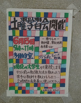 本日、本年度最初の「土曜自主学習会」を開催しました。「生徒自らが進んで自主学習を行う習慣を身につけること」を目的として、生徒が自分で問題集や授業中に配布されたプリント教材を解き、解らないところを学習ボランティアの大学生に質問するという方式で行っています。