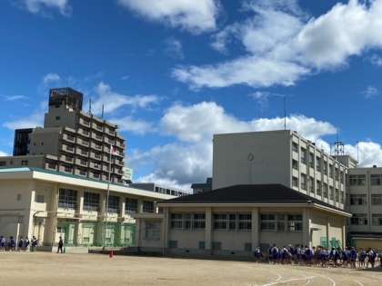 晴れ渡る青空のもと、体育大会開始に向けて生徒が運動場に移動しています。