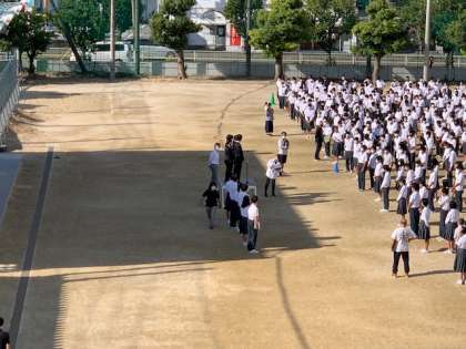 本日、久しぶりにグランドにて全校集会を行いました。