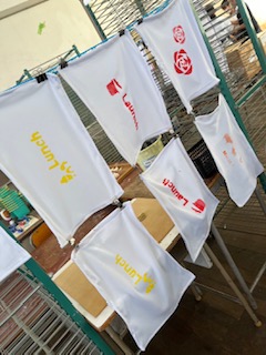 今日から、1年生SDGsの取り組みで残布を再利用して作ったランチョンマットに美術の授業をつかってイラストを入れました。