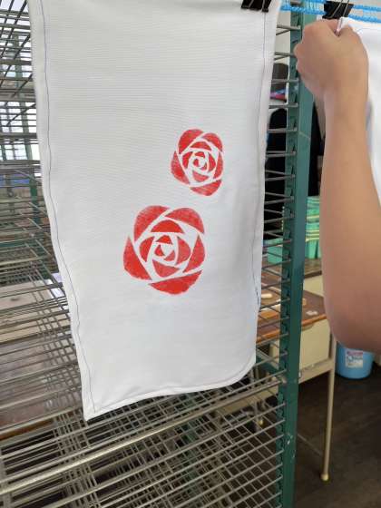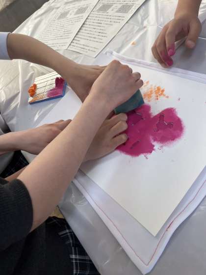 各クラスで作ったステンシルシートを使ってポンポンとインクをのせて仕上げます。