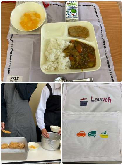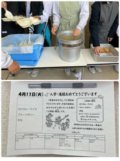 給食初日の献立は新1年生の入学をお祝いし、「カツカレー・フルーツゼリー・牛乳」の献立でした。