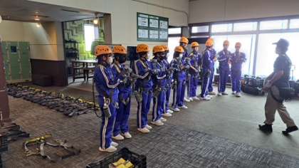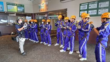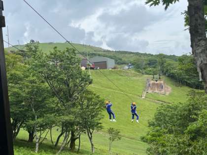 4〜6組は琵琶湖バレイで午前の活動が始まりました。インストラクターの方から説明を受け、ジップライン開始です。スタート前は怖がっていた生徒も一本跳ぶとコツをつかみ、空の旅を楽しんでいます。