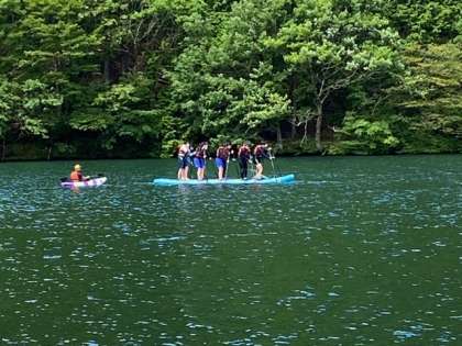 メガサップ体験の様子です。大きなボードに10人程乗って、立ち漕ぎをして進みます、始めは座って漕いでいましたが、コツをつかむと立って漕げるようになりました。掛け声で息を合わせて同じ方向を目指し、大自然の中、本当に楽しそうに体験しています。