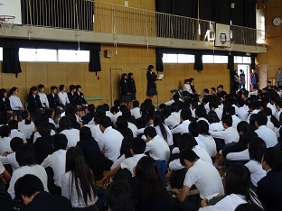 本日1限目に、体育館で生徒会役員演説会が行われました。
