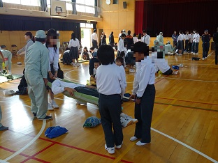 簡易搬送体験では、菅原・新庄・下新庄連合町会の防災リーダーのみなさん、東淀川消防署、東淀川区役所のみなさまのお世話により、毛布と物干しざおを使って、簡易の担架の作り方を教わって、実際に生徒たちが搬送作業を体験しました。