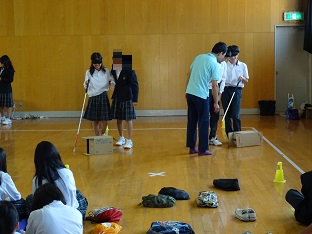 アイマスク体験は、東淀川区社会福祉協議会、東淀川区中部地域包括支援センターみなさまのお世話により、アイマスクをして、白杖を使って、介助者の助けをかりて障害物を避けて歩く体験をしました。