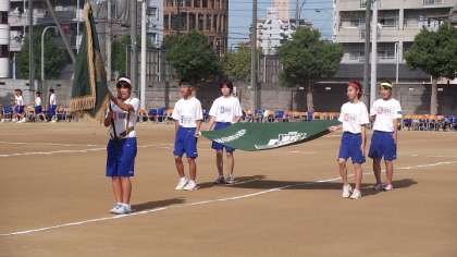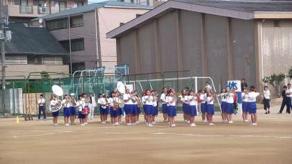 左側:吹奏楽部 右側:校旗を手に入場行進をした生徒会役員