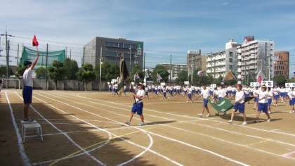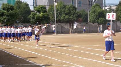左側:元気に入場行進を行う姿です。学級旗が地面と平行になっています。