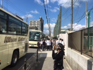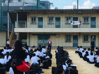 晴天の下、この移住の意義について、教頭先生から講話がありました。50期生としての3年生修学旅行に向けて、宿泊行事としての練習であること、栞通りの行動を全員で協力することが共有されました。