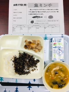 6/17(月) 献立内容 ごはん、鶏肉のてり焼き、みそ汁、魚ひじきそぼろ、牛乳 です。