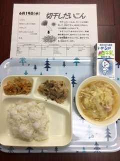 豚肉のごまみそ焼き、すまし汁、切干しだいこんのいため煮、ごはん、牛乳です。