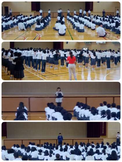 集会では、先生が中学校教員を目指すきっかけとなったできごとから、「素直な心、感謝の心をもっていろんなことを吸収できる人になろう」とお話がありました。