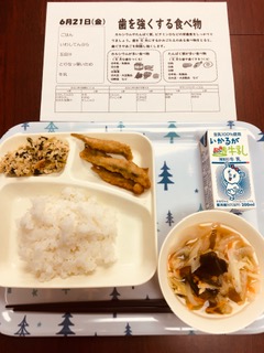 6/21(金) 献立内容 いわしてんぷら、五目汁、とりなっ葉いため、ごはん、牛乳です。