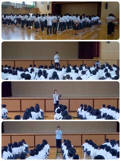 集会では、今日から始まる「合唱の取り組み」に当たっての心構え、来週月曜日に予定されている進路の取り組み予告、学年の様子等、先生方よりお話がありました。