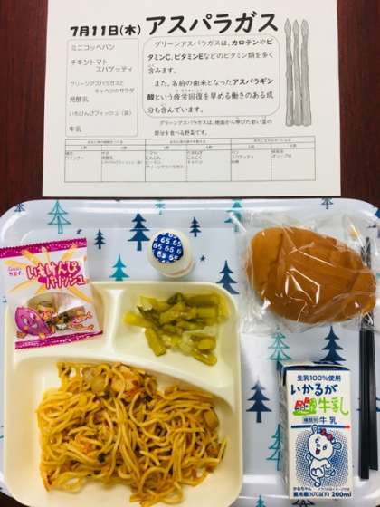 献立内容はチキントマトスパゲッティ、グリーンアスパラとキャベツのサラダ、発酵乳(アシドミルク)、いもけんぴフィッシュ(袋)、ミニコッペパンと牛乳です。