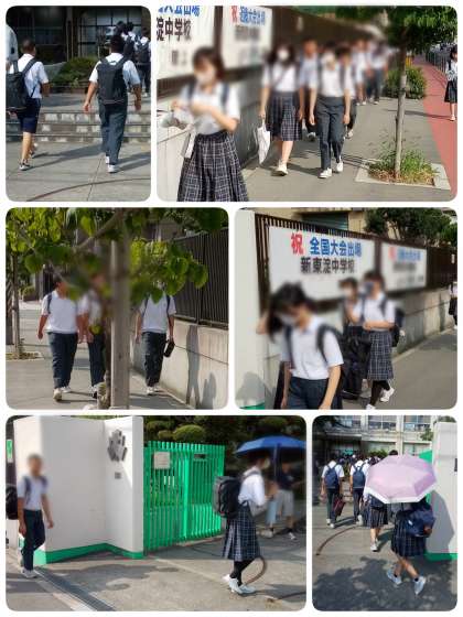 日傘をさしたり、うちわ、扇子、手であおぎながら歩いたり等、各々の方法で暑さ対策しながら登校する人が見られました。