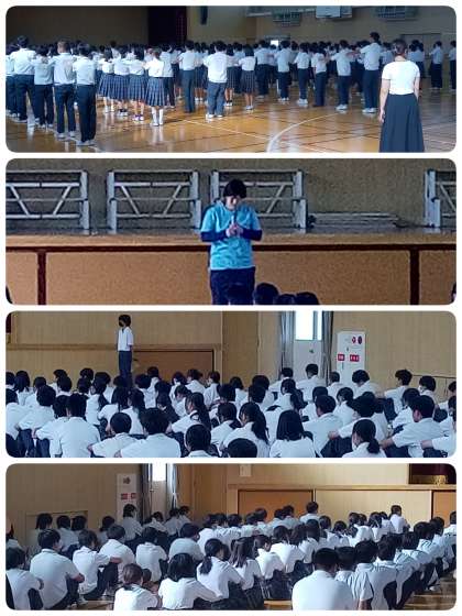 集会では、「カナダの中学生は部活動やお小遣いがなく、中2の学年の子たちはバイトでお金を稼(かせ)ぐ、ということをしている。皆さんは職場体験で、お金はもらわないけど働くということを経験する。その意味をしっかり考えて行動してほしい。」といったお話がありました。