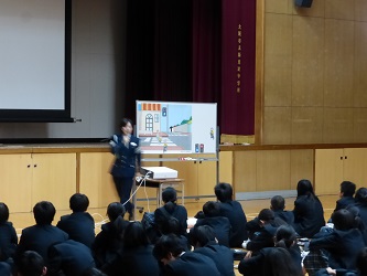 本日、12月2日(水)6限に、東淀川警察署 交通課より講師をお招きして、「交通安全教室(1年)」を体育館にて行いました。