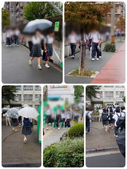 傘をさす生徒、傘に入れてもらっている生徒、傘を持たない生徒、傘を持っているけどささない生徒等、様々なパターンが見られる登校風景でした。