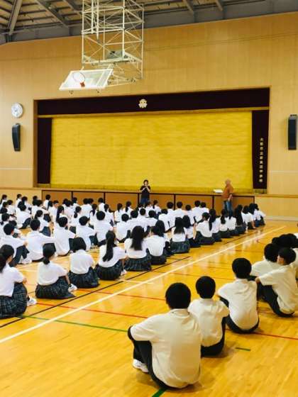 体育館にて学年集会が開かれ2人の先生から講話がありました。最初のお話は、習慣の大切さと人の話をしっかり聴くことについて、2つ目のお話は、今の1年生の学校生活について、相手の気持ちを考えて行動し、学校生活の安全・安心をお互いに守ってほしいことが再認識されました。