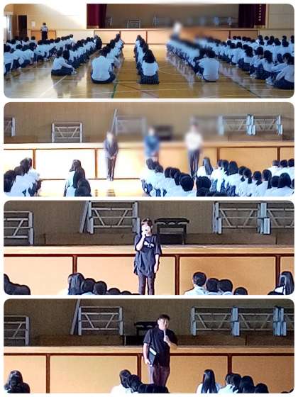 集会では、学年担当になった教育実習の先生方の自己紹介と、代表の先生から「自らすすんであいさつしましょう」というお話がありました。