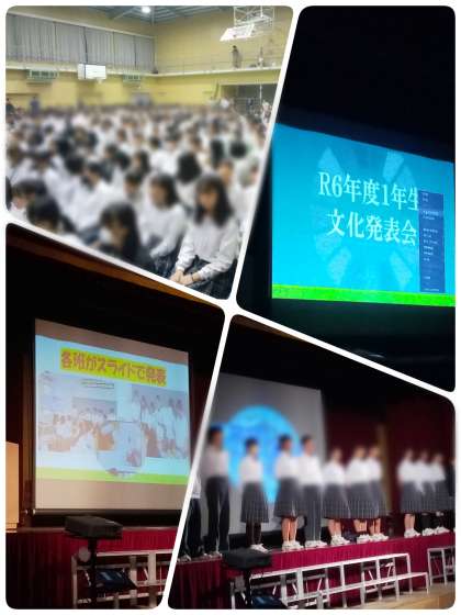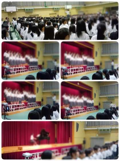上が1年生の発表「SDGs」、下が2・3年生各学年代表クラスによる合唱、3年生学年合唱です。