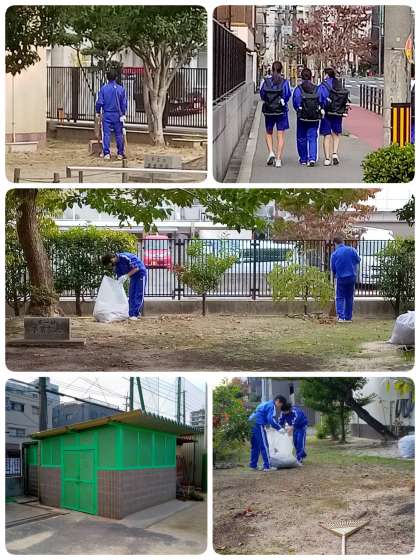 職場体験で、正門前に集合して事業所へ向かう2年生、正面入口付近を整備する2年生の(1時間目の)様子です。