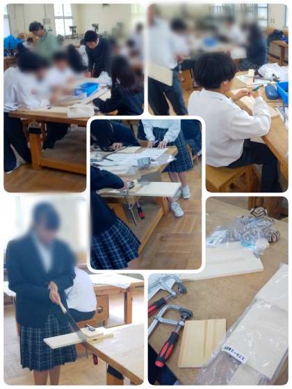 木材加工の単元で、本立て等、自ら設計して木材に線を引き、鋸(のこぎり)を用いて、木材を様々な形に切り分ける作業を行いました。