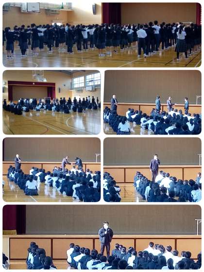 集会では、まず「国名コンテスト」の成績発表があり、満点賞42名、クラス優秀賞の2組と4組が表彰されました。