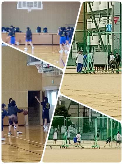 写真は、男子バスケットボール部、吹奏楽部、野球部、女子バスケットボール部、テニス部の活動の様子です。