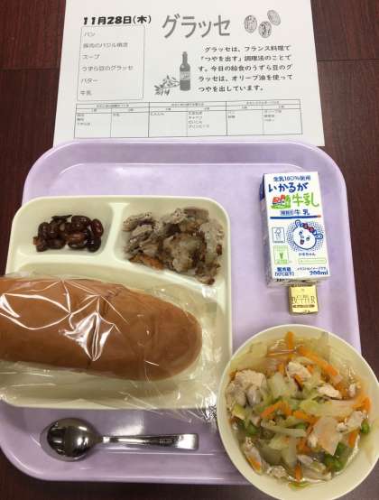 つや煮とかバター煮等、小たまねぎ、にんじん、マッシュルームなどの野菜のグラッセが一般的だそうで、給食では「うずら豆」を使用しています。