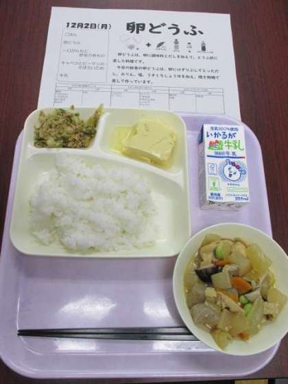 本日の献立内容は、卵どうふ、一口がんもと野菜の煮もの、キャベツとピーマンのそぼろいため、ごはんと牛乳です。