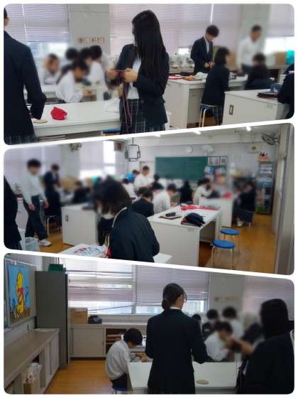上……2年生家庭科の授業で、被服室にてミサンガの作成