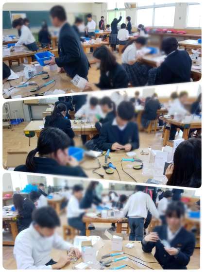 下……2年生技術科の授業で、技術室にてラジオ作り